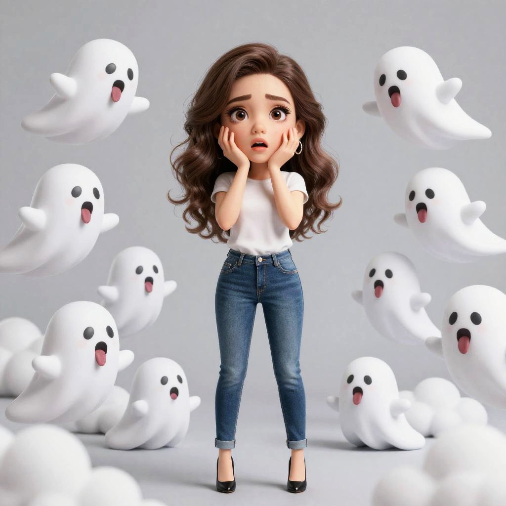 Photorealistic chibi art style, a beautiful woman in jeans and high heels, facing the viewers pretending to be scared, both hands on face, artistic, artist, simple volumtric light background, swirling clouds, ColorART, many cute ghosts with tongues out, chibi