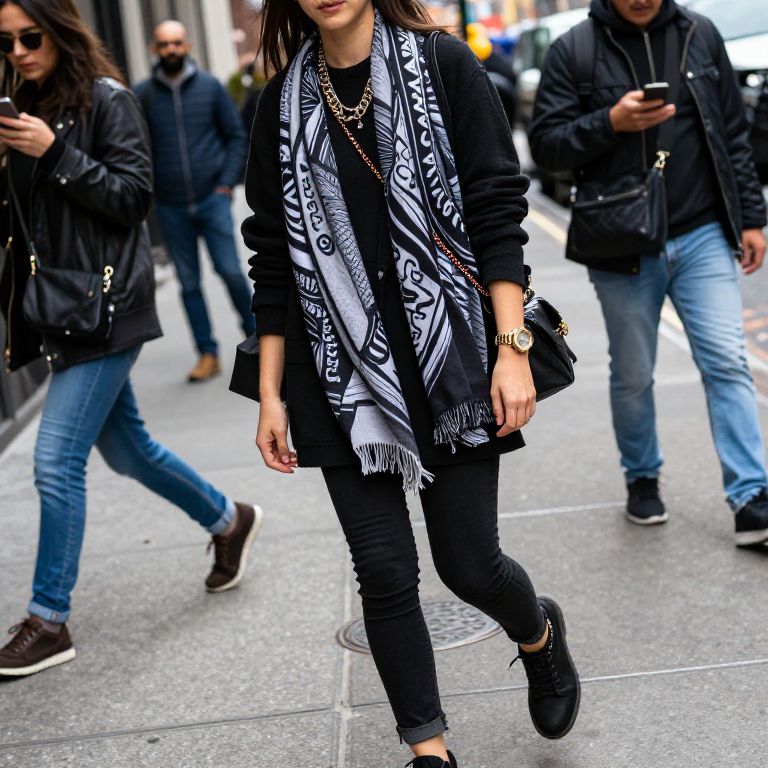 Photograph of a stylish woman with black outfit, patterned scarf, and black boots walking on a busy urban street with blurred pedestrians.