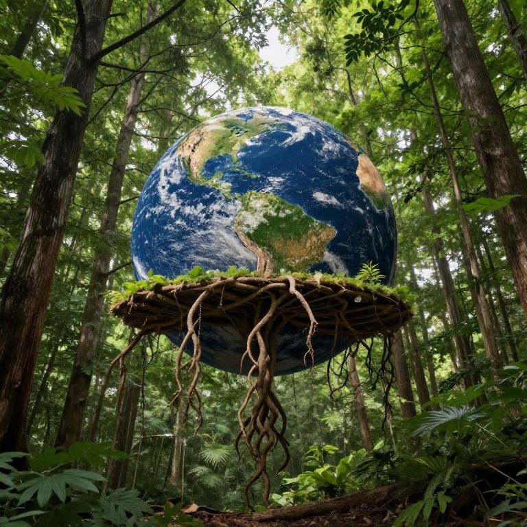 Photograph of a surreal forest scene with a large, floating Earth suspended above a tree root platform covered in green moss. The Earth, detailed with vibrant blue oceans, white clouds, and green and brown landmasses, hovers amidst tall, dense trees with sunlight filtering through the foliage. Root tendrils extend from the platform, blending with the forest floor. The image combines realistic forest elements with a fantastical, nature-inspired concept, creating a striking juxtaposition of Earthly and natural worlds. The overall color palette includes lush greens, browns, and blues.