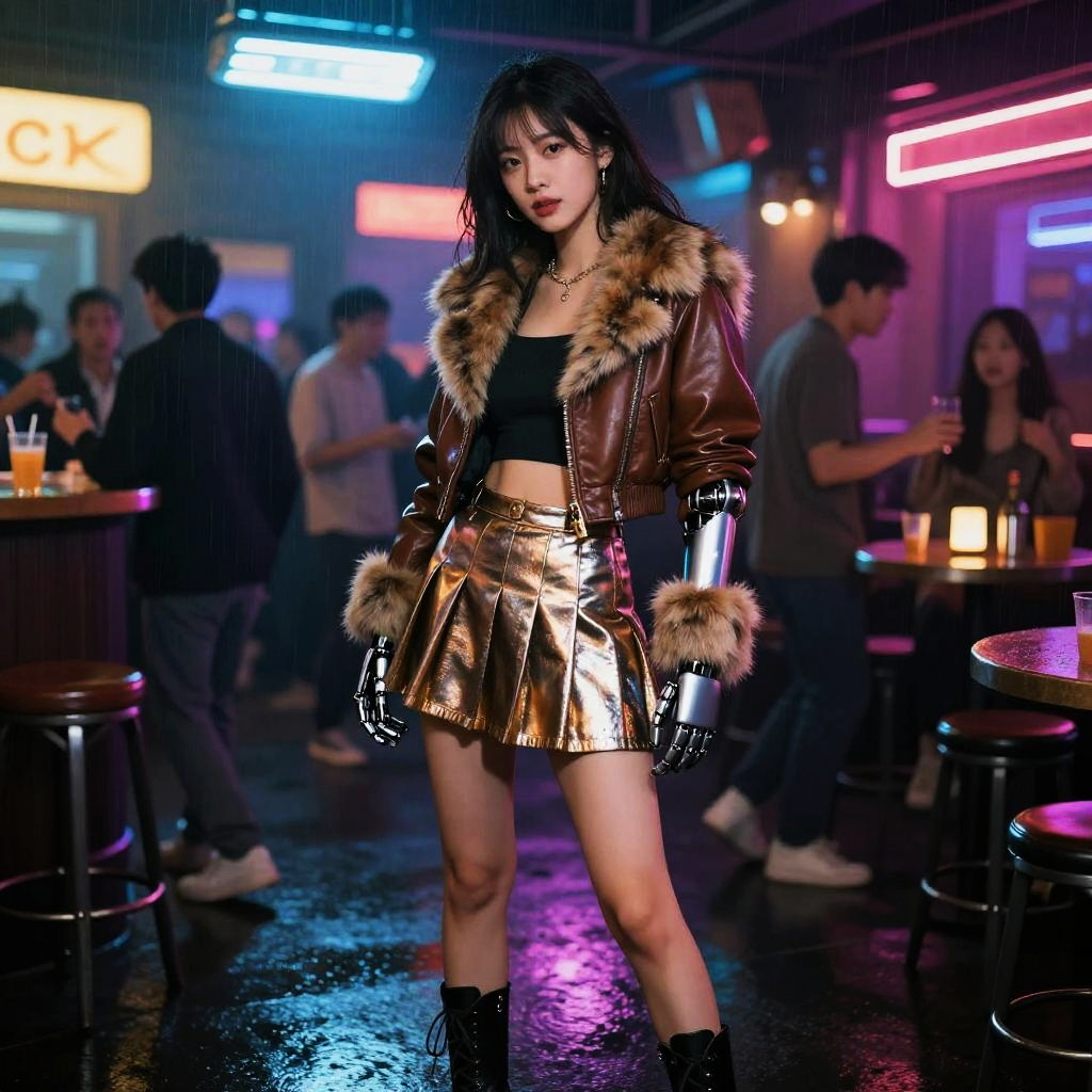 Young woman with a sleek prosthetic arm with fur-trimmed leather jacket, metallic pleated skirt and combat boots enjoys a lively party in underground cyberpunk jazz speakeasy beneath rain-soaked neon streets, surrounded by vibrant colors and soft shadows.