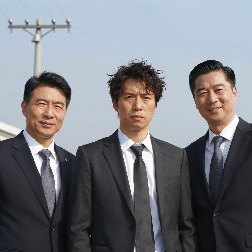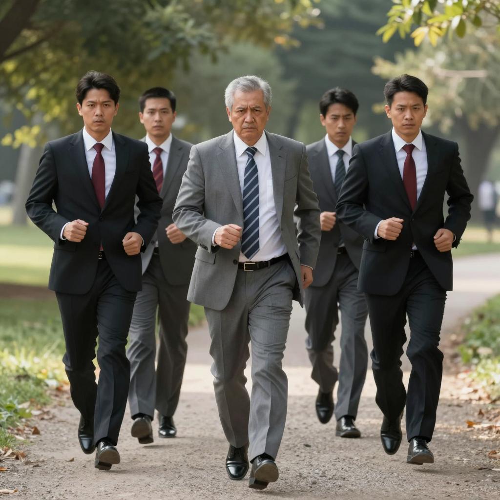 Group of five Asian men in business suits running purposefully down a gravel path in a park. The leading man has gray hair and wears a gray suit with a striped tie, while the others wear dark suits with white shirts and red or dark ties. Sunlight filters through green trees in the background, creating a natural outdoor setting.