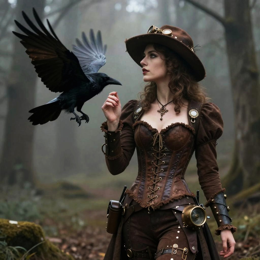 A confident woman dressed in a detailed brown steampunk-inspired corset and hat stands in a misty, gloomy forest. A black raven is captured mid-flight beside her, adding a mysterious and gothic atmosphere to the composition.