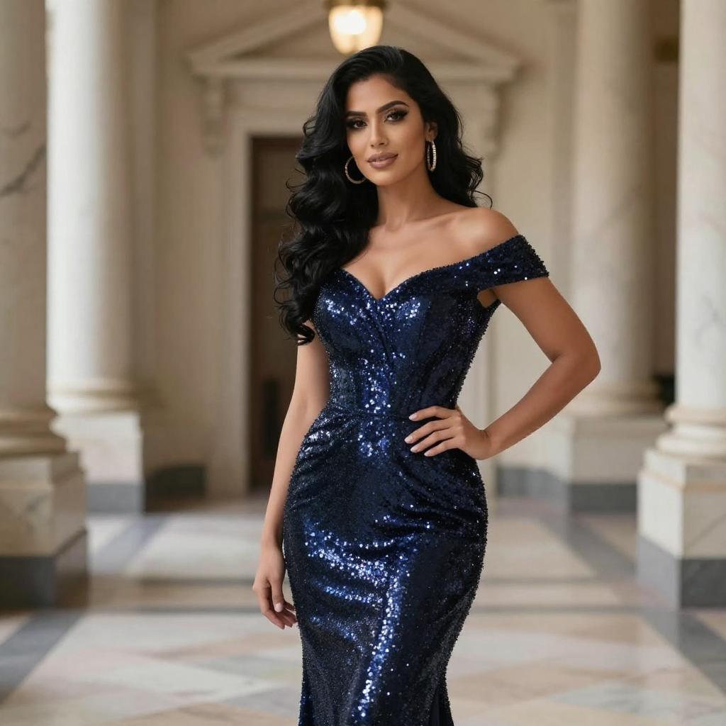 Photograph of a woman with long, wavy black hair, wearing a form-fitting, off-the-shoulder, dark blue sequin gown. She stands confidently in a grand, marble-floored hall with tall, illuminated columns in the background. She has hoop earrings and a slight smile, with one hand on her hip.