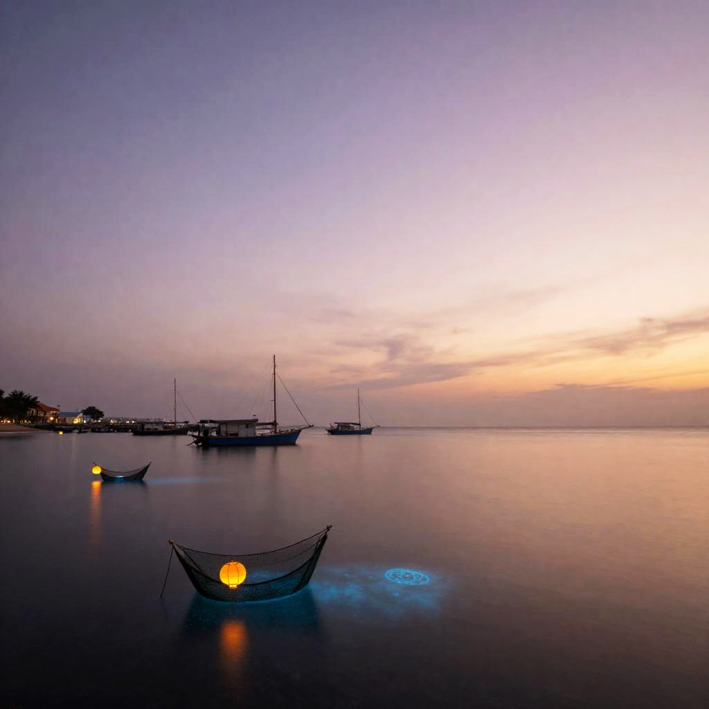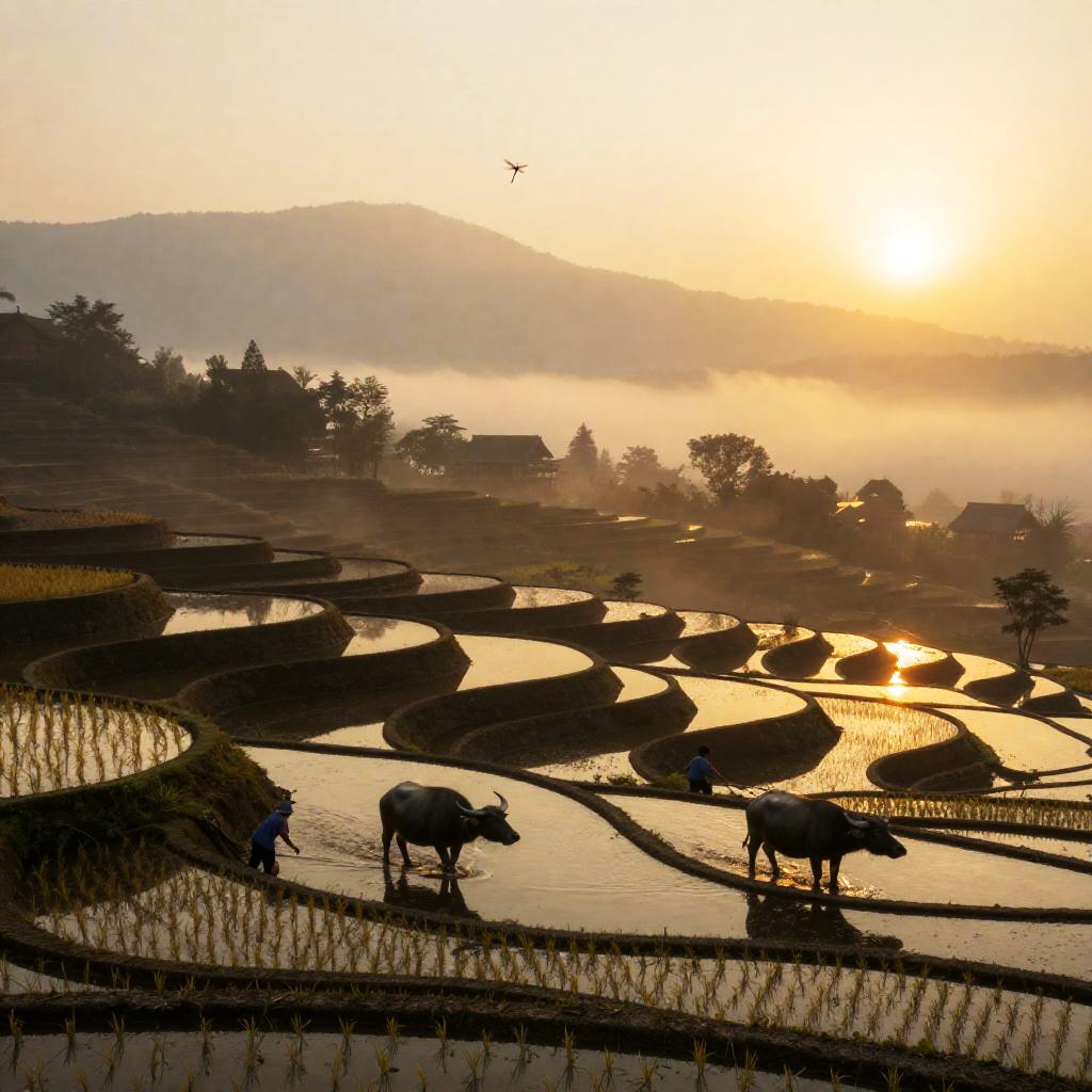 The sunset lantern festival paints the evening in honeyed light, casting a warm golden glow across the sky. The rooftop gardens and terraces hung with glowing paper lanterns, with locals strolling between potted trees as lanterns are released into the violet sky.