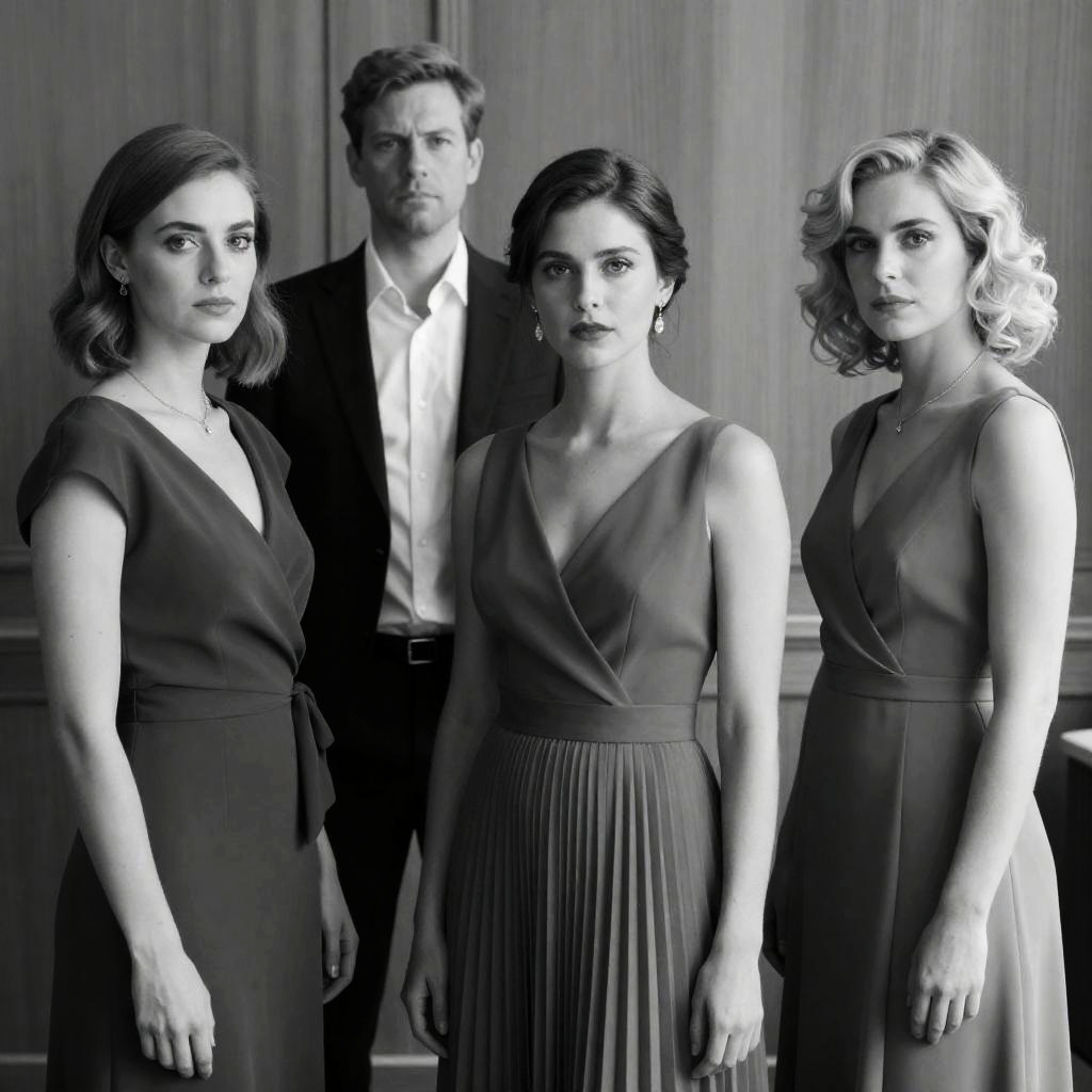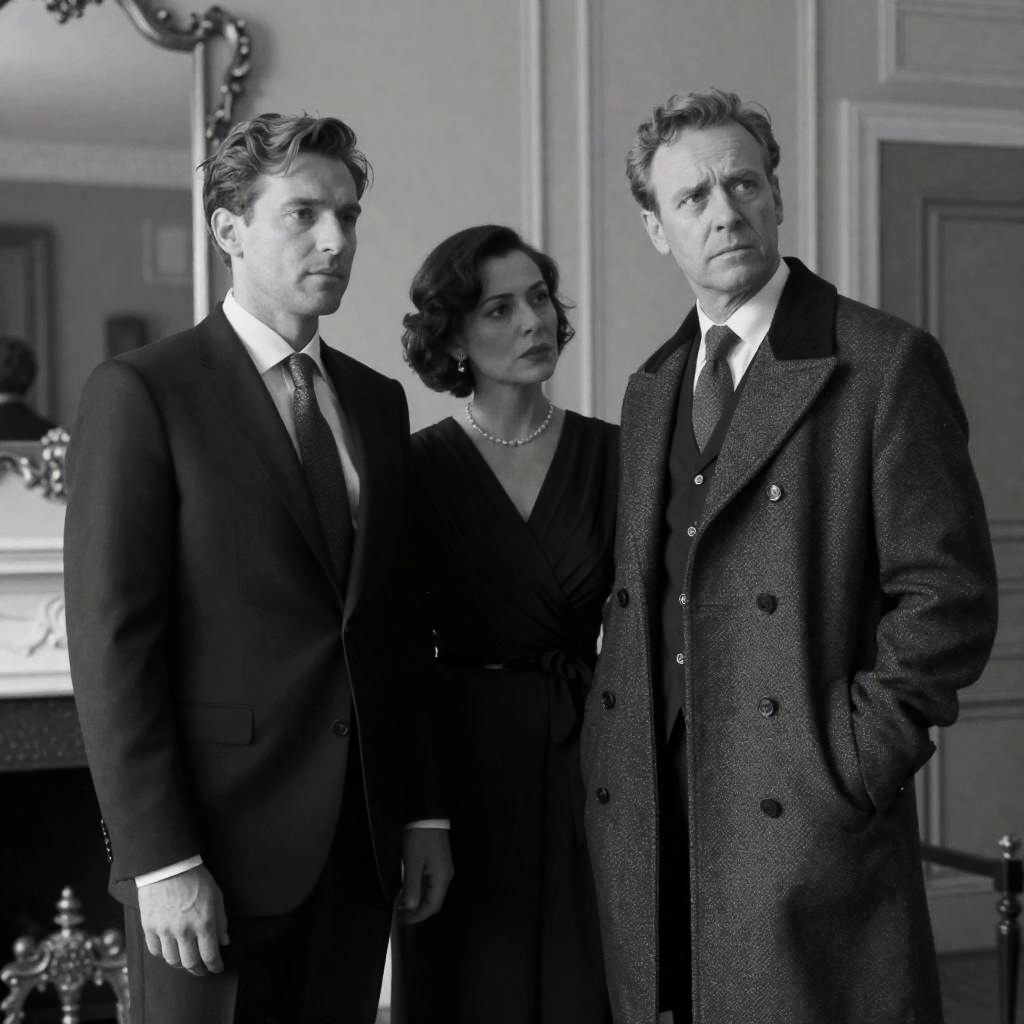 Movie poster. Three people. Black-and-white photo. Man on left, beard, vest, white shirt, gesturing. Man in center, suit, tie, holding guitar. Woman on right, short dark hair, floral dress, white coat, holding handbag. Background: industrial setting. Intense expressions.