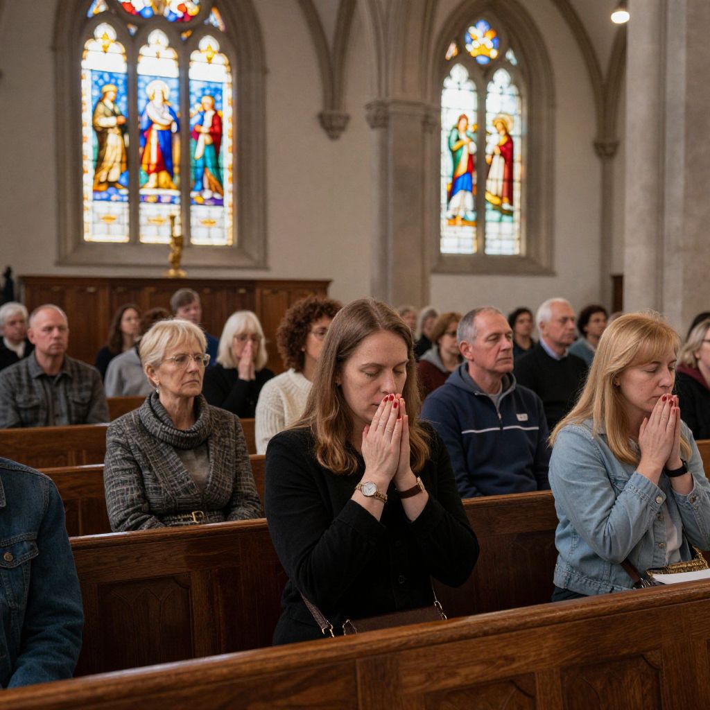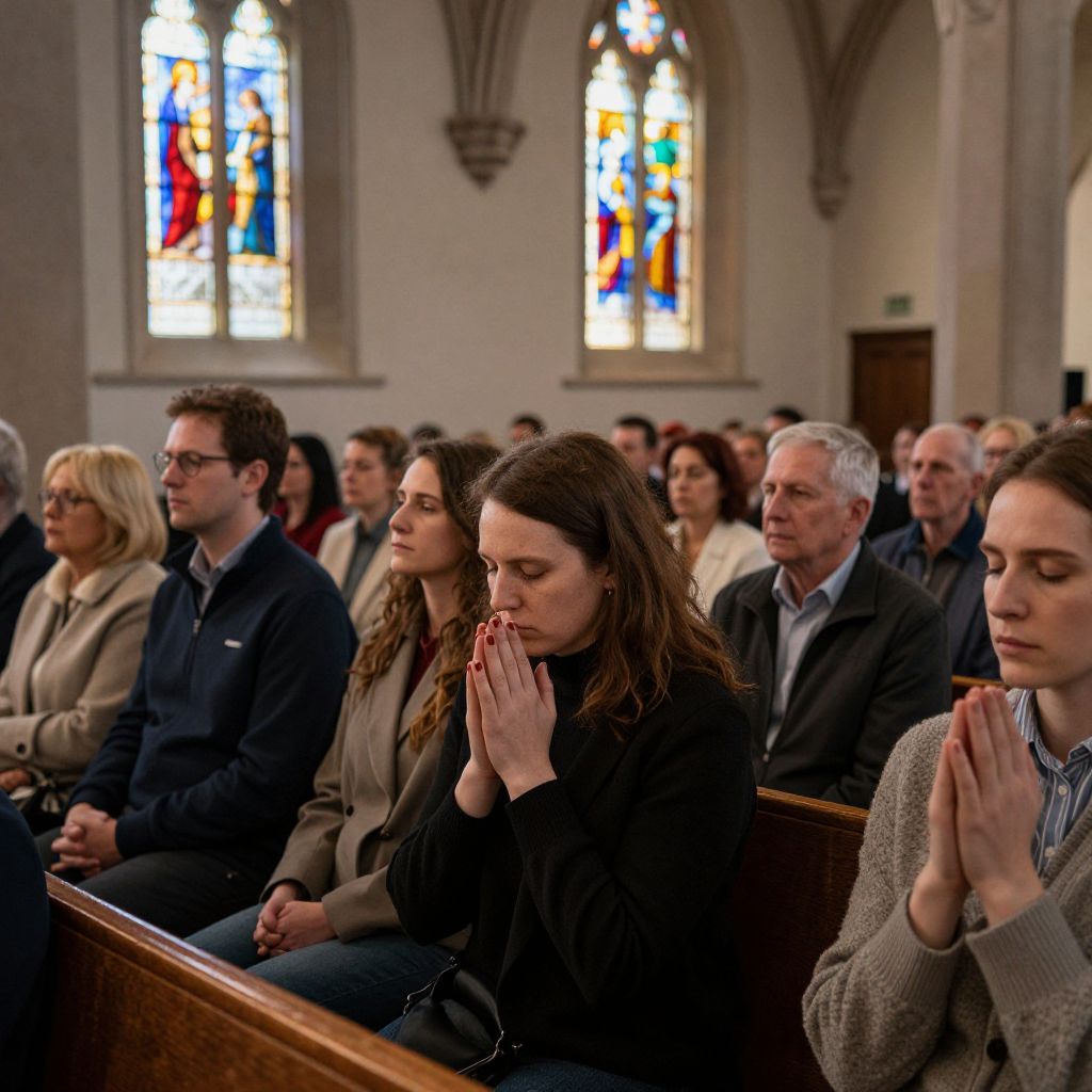 Parishioners gather in a serene church, with stained glass windows casting colorful light as a woman in the foreground prays with hands clasped, surrounded by rows of wooden pews filled with attentive worshippers.