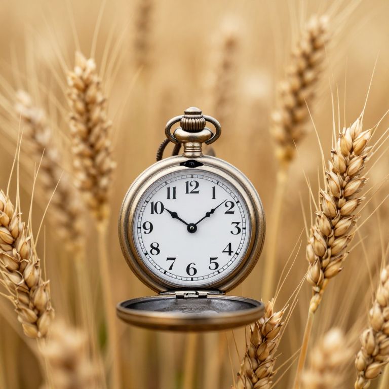 A vintage pocket watch stands prominently atop a wheat field, its hands pointing to 10:10, surrounded by golden stalks swaying gently in the background.
