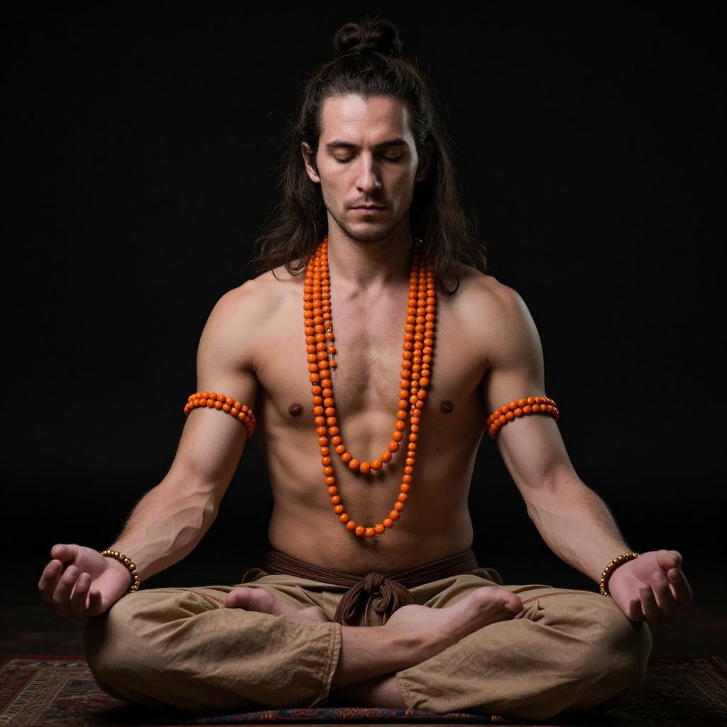 A serene man with long hair tied in a top bun is shown meditating in a dimly lit environment, adorned with multiple bright orange bead necklaces and arm bands. The photograph emphasizes a spiritual and contemplative mood, highlighting the subject's muscular physique and traditional accessories against a deep black background.