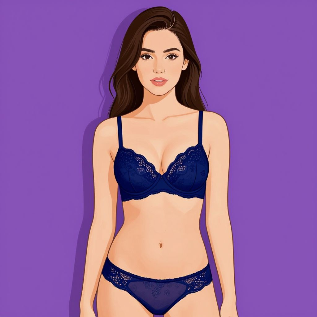 Digital drawing of a young woman with long, dark brown hair and fair skin, standing against a solid purple background. She's wearing a matching navy blue lace bra and panties. Her bra is slightly padded, highlighting her medium-sized breasts. She has a neutral expression, with subtle makeup and a slight smile. The style is clean and vibrant, with bold outlines and flat colors.