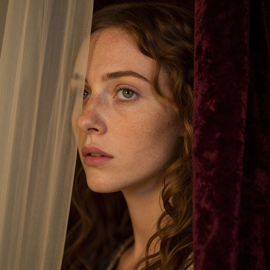 Photograph of a young woman with fair skin and freckles, gazing thoughtfully to the left. She has wavy, brown hair and green eyes, with a soft, natural expression. She is partially hidden behind a sheer, white curtain on the left and a dark purple curtain on the right. The lighting is warm, highlighting her facial features and the texture of her hair. Her lips are slightly parted, and her eyebrows are gently arched. The background is blurred, keeping the focus on her contemplative face. The overall mood is introspective and serene.