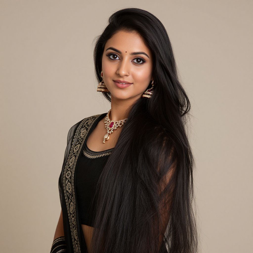 Very long hair indian, 1girl, jewelry, solo, earrings, black hair, long hair, necklace, realistic, looking at viewer, makeup, smile
