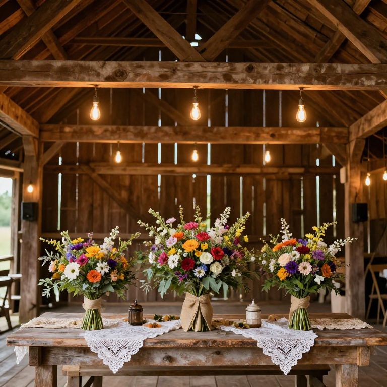 Photograph of rustic wooden barn with three vibrant floral centerpieces on a wooden table, lace runners, and hanging light bulbs.