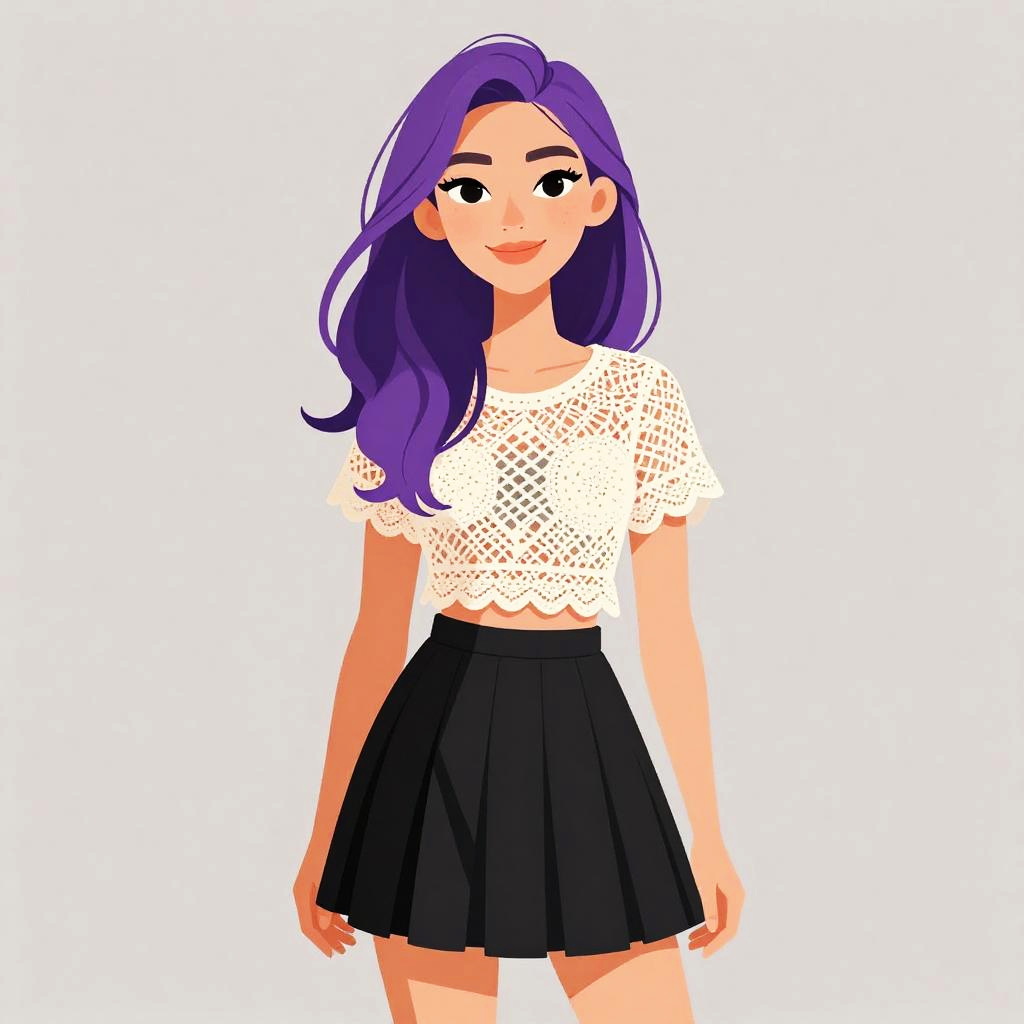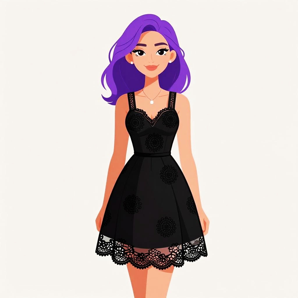 Digital illustration of a young woman with vibrant purple hair, styled in loose waves, and fair skin. She has large, expressive brown eyes and a slight smile. She wears a sleeveless, black lace-trimmed dress that flares out at the waist, revealing a delicate, white lace underlay at the hem. The dress has a modest neckline with thin straps. Her pose is relaxed, with arms slightly away from her body. The background is plain white, making her the focal point of the image. The art style is clean and vibrant, with bold colors and smooth lines.