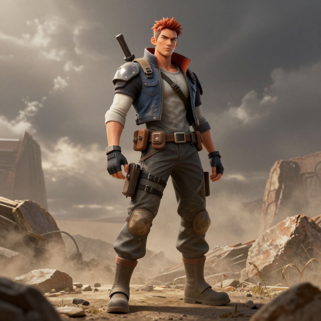 Digital art of a muscular, red-haired man in a blue jacket, black pants, and boots, standing in a dusty, ruined landscape with a rifle