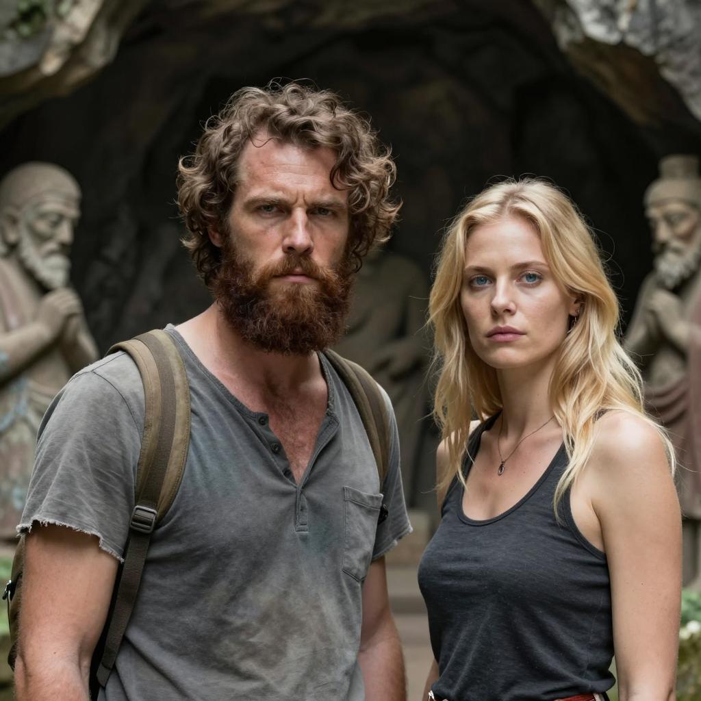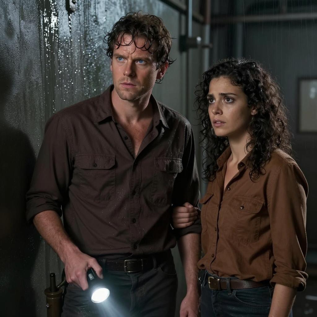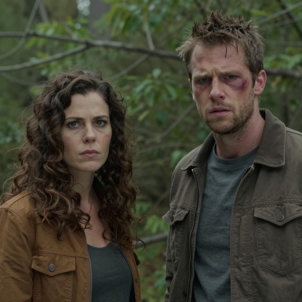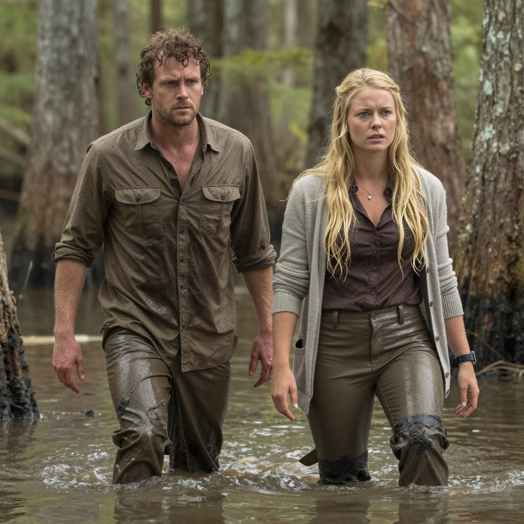 Photograph of two people wading in a swamp. The man with curly brown hair and a brown shirt looks forward with a concerned expression. The woman with long blonde hair, a gray cardigan, and a brown shirt looks ahead with a determined expression. Trees and cypress trunks surround them. Mud and water cover their lower bodies. Both have wet hair and clothes.