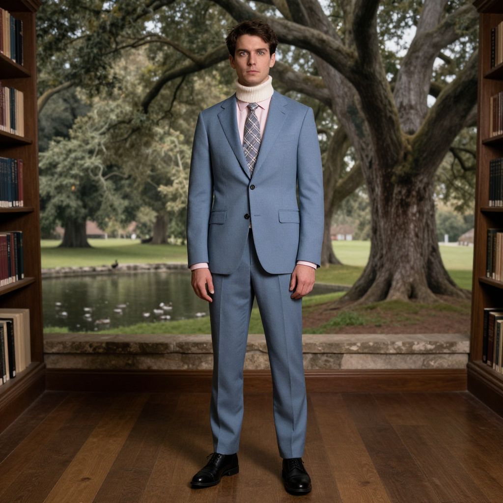 Photograph of a young man standing in a library-like room with wooden bookshelves on both sides. He has short, dark hair and a serious expression. He wears a light blue, single-breasted suit with a white dress shirt and a patterned tie. Black leather dress shoes complete his outfit. The background features a large tree with sprawling branches and a serene pond with ducks, visible through a window. The room has a polished wooden floor, and the lighting is soft, highlighting the man and the natural outdoor scenery behind him.