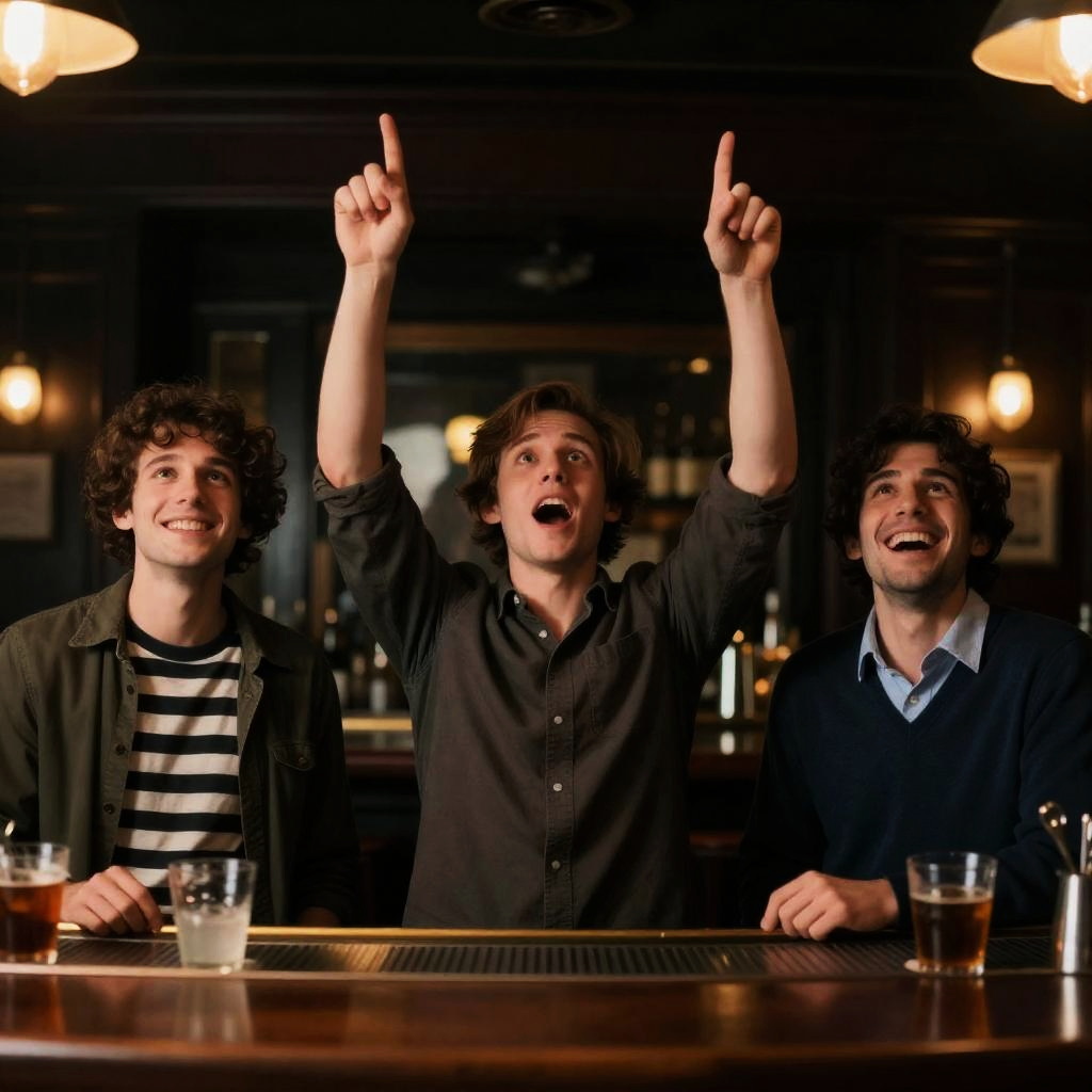 Two men in a cozy room. Left man with messy brown hair, white shirt, beige pants, arms raised, mouth open, holding a bottle. Right man with short brown hair, navy polo, plaid pants, smiling, fists clenched. Yellow wooden walls, framed painting, fireplace, lanterns, decorative items. Right man's face shows a friendly smile, left man's face shows excitement.