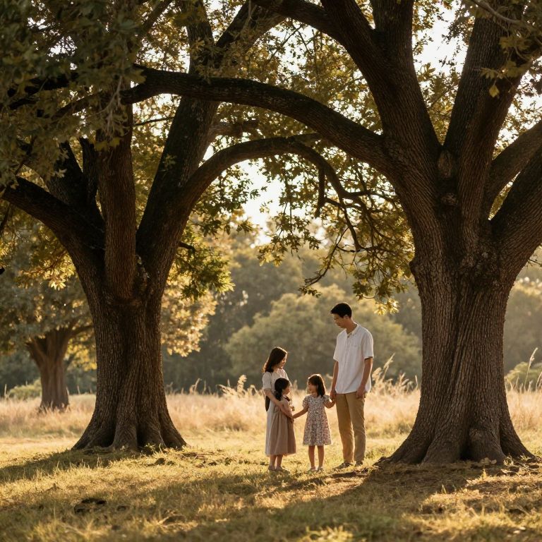 Photograph of a family standing under large, sunlit trees in a golden grass field at sunset, with warm, dappled light.