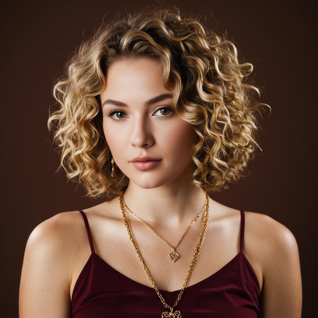 Short curly weave bob, photorealistic portrait of a young woman with curly brown hair with blonde highlights, blue eyes, wearing a maroon spaghetti strap top, layered gold necklaces, neutral brown background, soft lighting, realistic ures, detailed facial features, close-up, studio shot, slightly serious expression