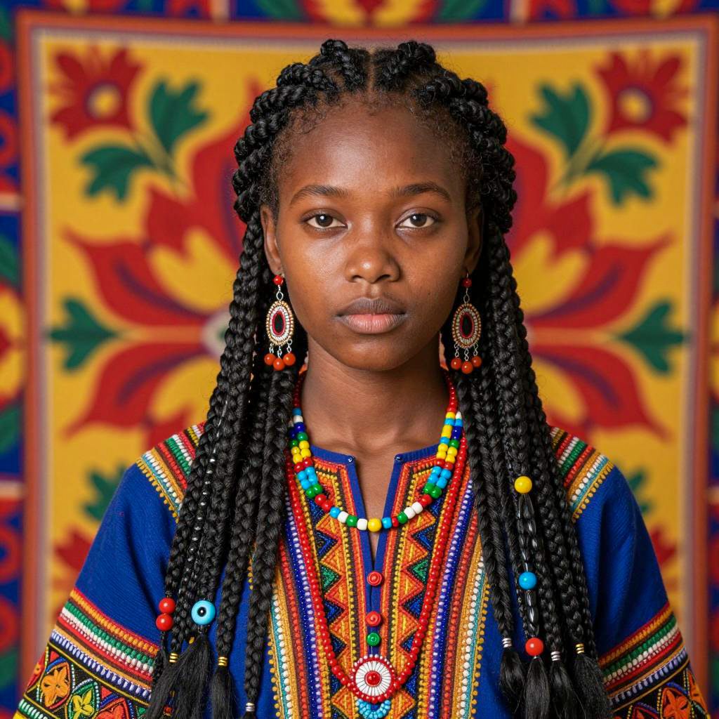 Young woman with dark skin and long black braided hair, wearing colorful traditional attire with intricate beadwork and embroidery. Her expression is neutral. Background features bright, vividly patterned ile with floral designs. Multiple necklaces and large bead earrings. Upper body shot. Vibrant, detailed colors and ures. Photographic style.