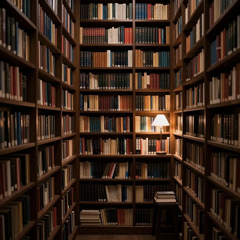 Photograph of a dimly lit, narrow library aisle with tall, wooden bookshelves on both sides, filled with a mix of colorful, vertically arranged books. A warm, white lamp hangs from the ceiling in the middle background, casting a soft glow. The shelves are packed tightly, creating a dense, vertical texture. The warm light contrasts with the dark, rich wood of the shelves, highlighting the variety of book colors and creating a cozy, inviting atmosphere. The perspective draws the eye down the length of the aisle, emphasizing the depth and organization of the library.