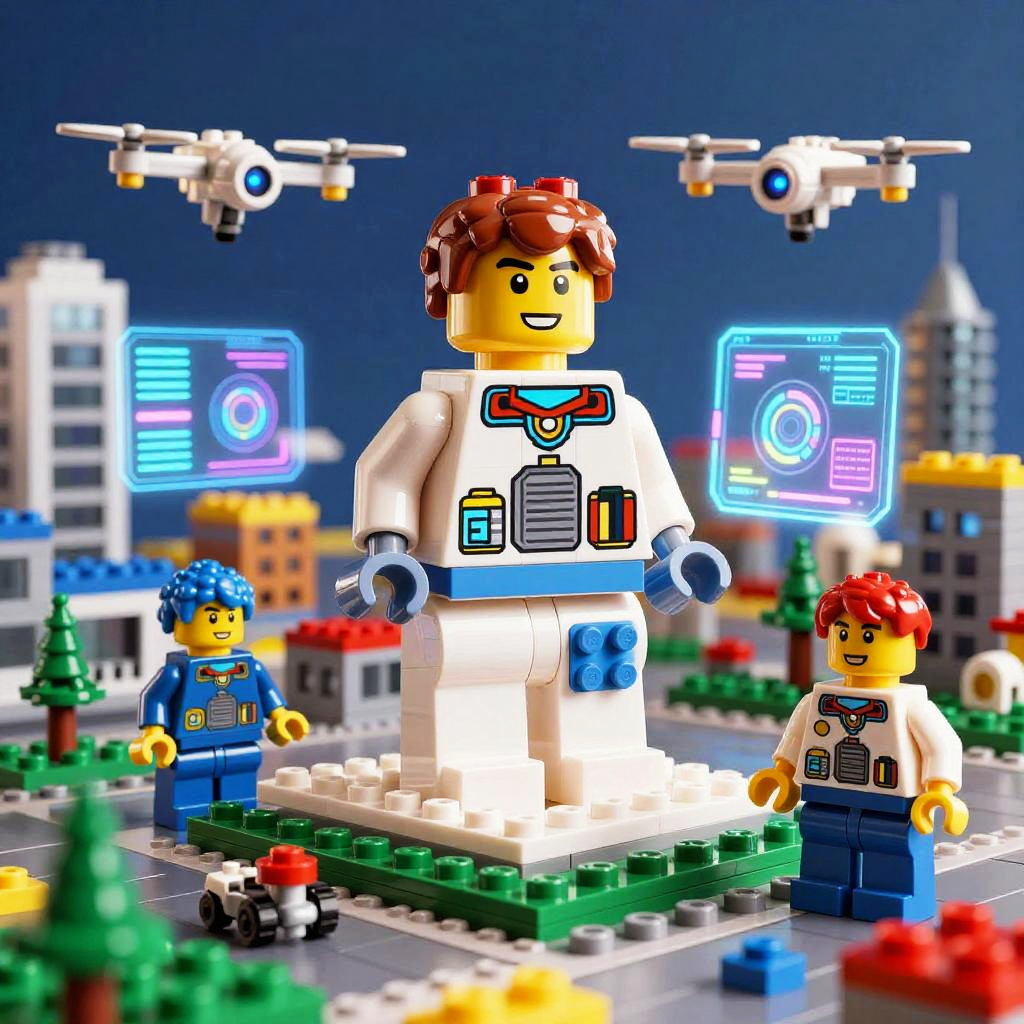 Lego city with AI drones and holographic interfaces