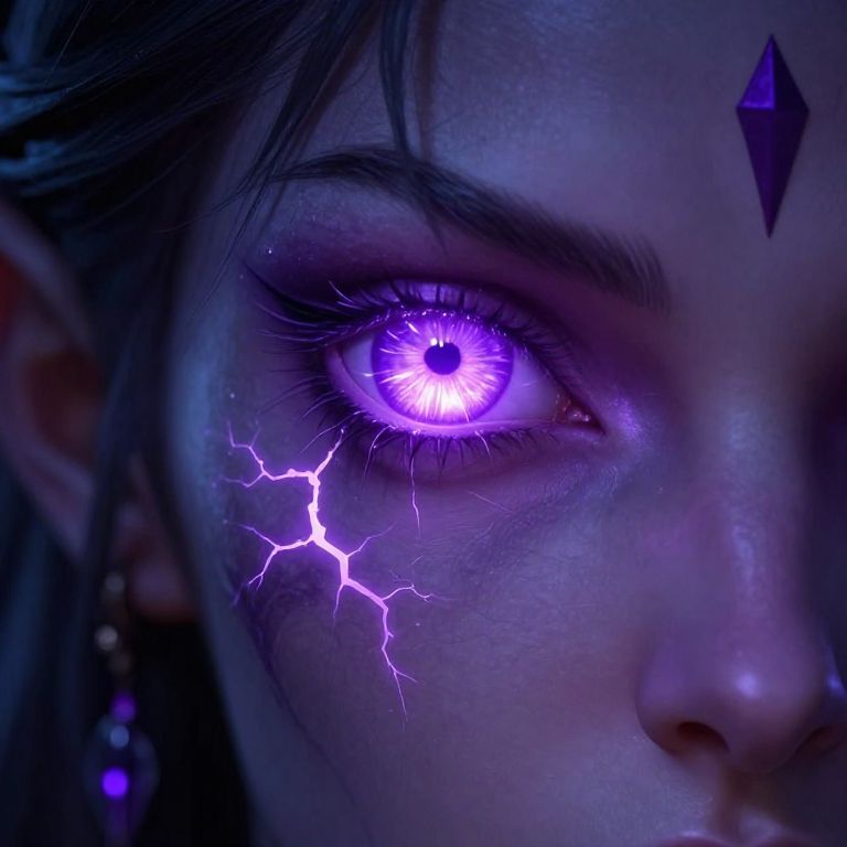 Epic tiefling eye color glowing intensely under moonlight, piercing violet eyes with crackling energy, mysterious demonic heritage, fantasy RPG style, highly detailed character art