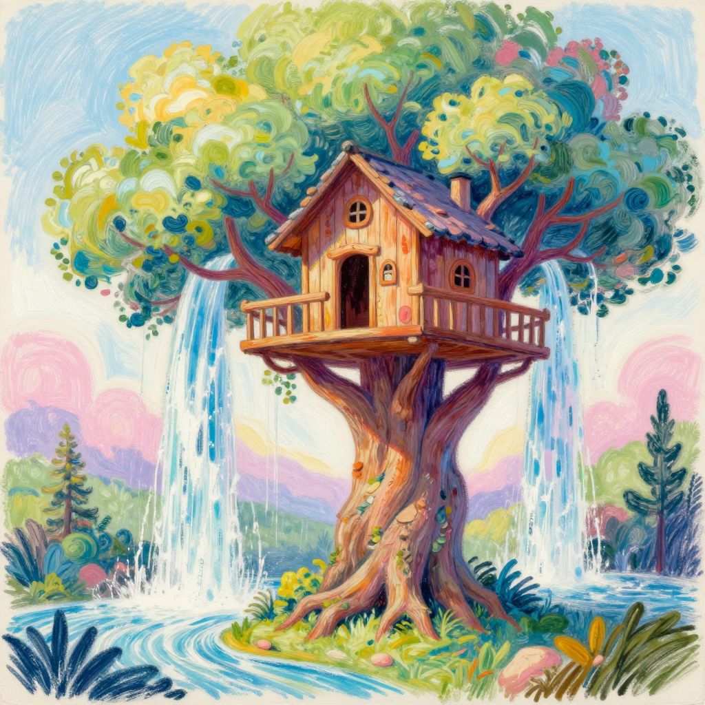 A surreal oil pastel artwork depicting a vibrant and whimsical treehouse built within a large blue tree, surrounded by colorful trees and a dramatic, multicolored sky in bold expressionist strokes, evoking a sense of wonder and fantasy.
