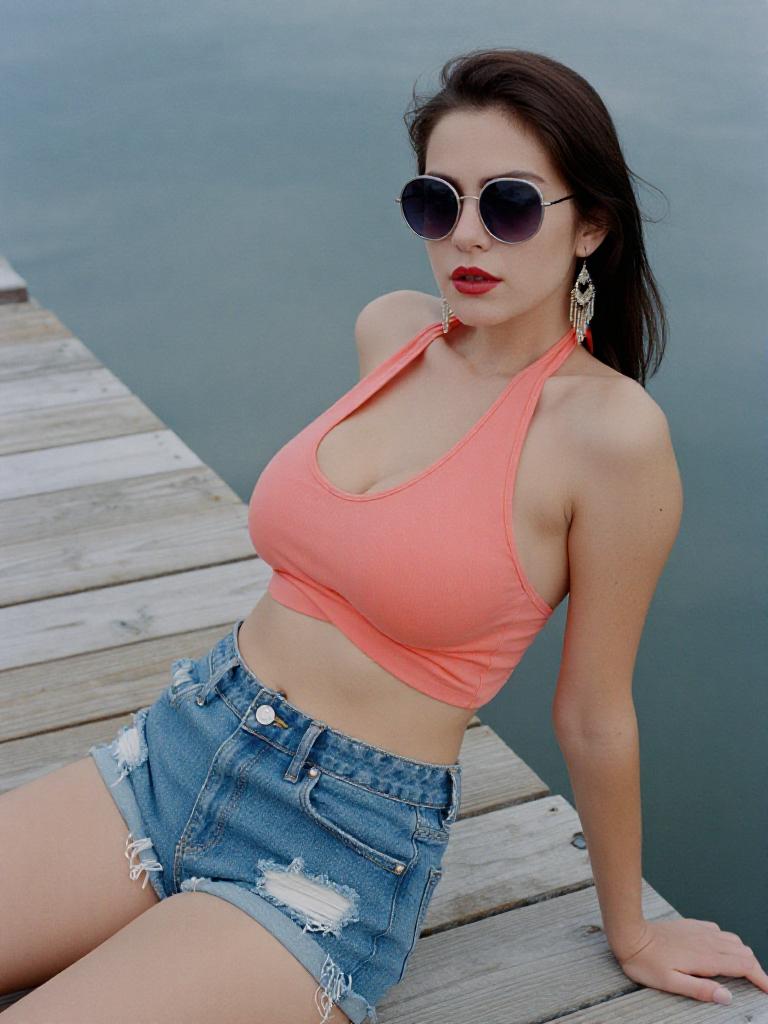 A Hourglass woman in a technicolor analog film stock style, wearing a coral cropped halter top and distressed denim shorts, lounging on a wooden pier at a lagoon, with round oversized sunglasses and dangle earrings. Sexy. Pretty face and beаutiful eyes. Big breasts