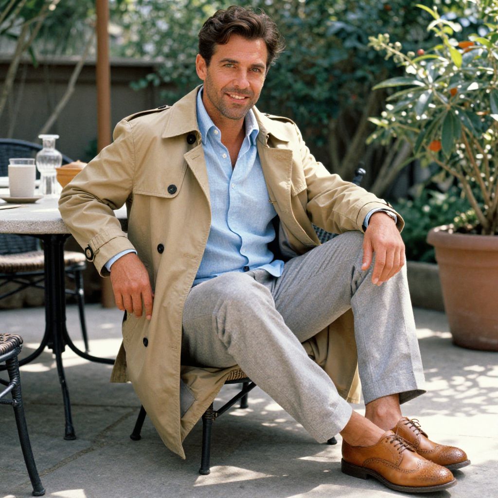 Portrait of a man sitting on a sunlit garden patio wearing a khaki trench coat, pastel blue linen shirt, stone slim fit trousers, and tan leather brogues. He has a masculine face with piercing eyes and a relaxed smile, creating a fresh and breezy aesthetic. The setting includes outdoor furniture and potted plants, emphasizing a casual yet stylish atmosphere.