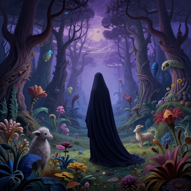 Digital artwork depicting a mysterious, dark-robed figure standing in a vibrant, magical forest. The figure, shrouded in a long, flowing black cloak, faces away from the viewer. Surrounding the figure are colorful, fantastical flowers and plants, including large, exotic blooms in pink, purple, and orange. Two fluffy, white sheep graze on the left and right, while a blue bird and a green snake hang from trees. The forest is dense with twisted, dark trees, illuminated by a bright, ethereal purple moon in the background. The scene is richly detailed, with a whimsical, enchanting atmosphere.