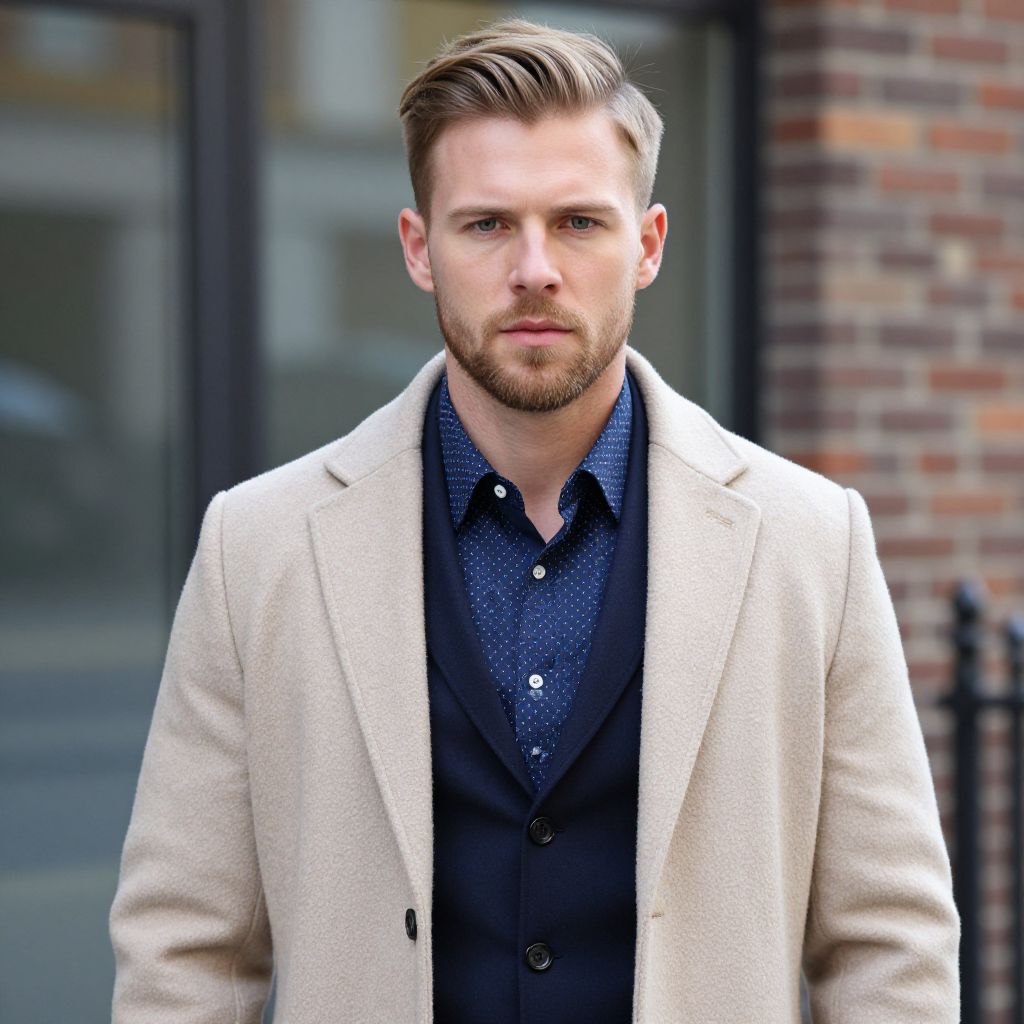 Photograph of a handsome, fair-skinned man with short, neatly styled blonde hair and a light beard. He's wearing a beige wool coat over a navy blue, patterned dress shirt and a dark blue vest. He stands in front of a blurred urban background with glass and brick. His expression is neutral, and he looks directly at the camera. The lighting is natural, highlighting his clean, stylish look.