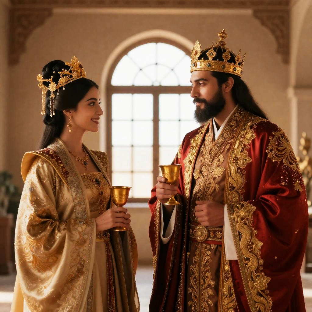 A bearded man and woman dressed in luxurious, intricately embroidered royal robes and crowns stand facing each other inside a historic architectural setting. The man wears a richly decorated red and gold robe with an elaborate golden crown, while the woman wears a gold and silver headdress and robe with detailed embellishments. Both hold gold goblets and the woman smiles warmly at the man.