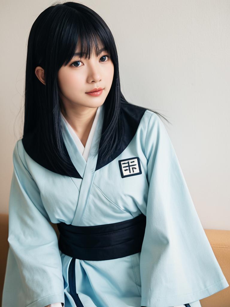 Portrait of an Asian woman dressed in a light blue and black Yumi Yoshimura cosplay costume. She has straight black hair with bangs and is posing against a plain light-colored background. The costume features wide sleeves and a traditional design inspired by the character Yumi Yoshimura.