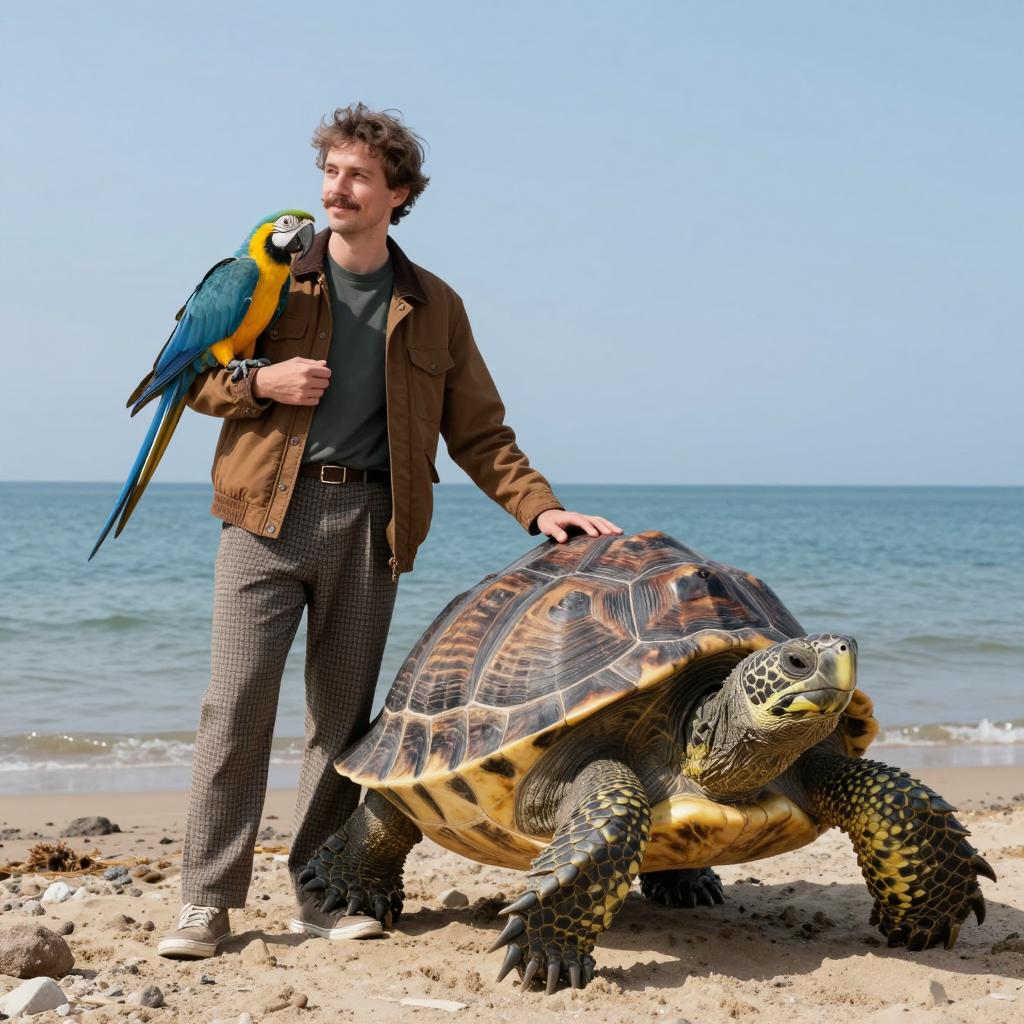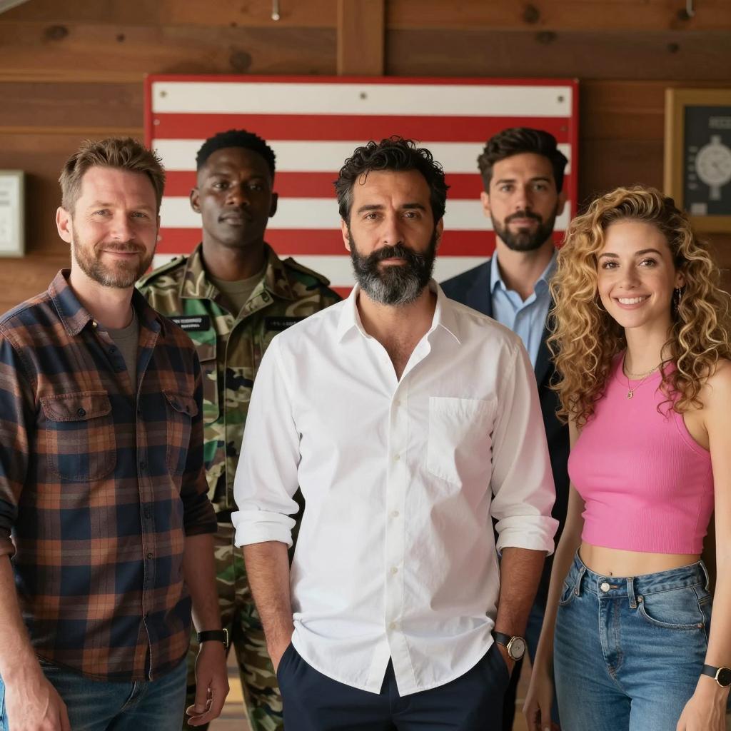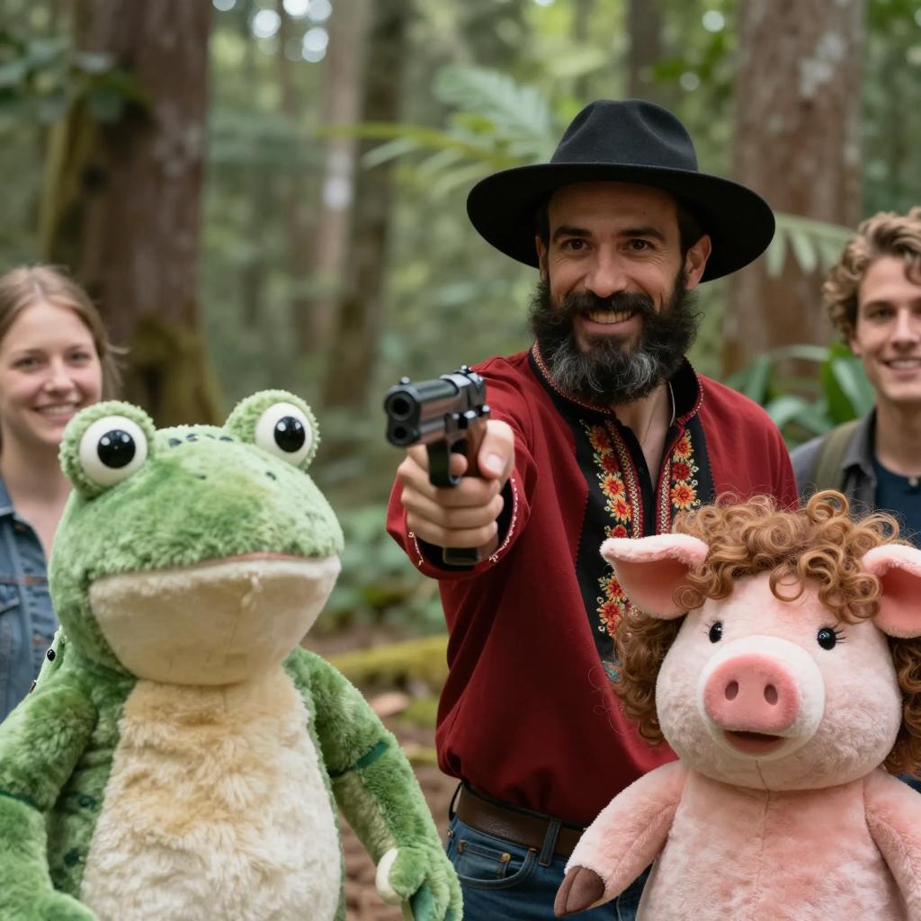 Photograph of four people and a lemur. The lemur is perched on the chin of a man in a white suit and blue shirt. The man has a mustache and closed eyes. Another man in a dark suit and blue shirt stands to the left, smiling. A woman with red hair and a black top is to the right, leaning in. The background is green and blurred. All people are smiling. The man in the white suit holds the lemur's back with his right hand.