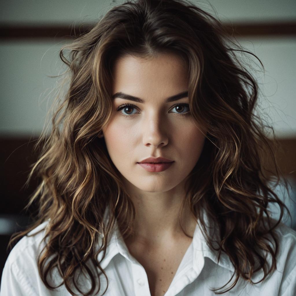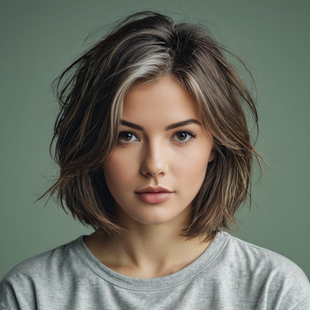 Short hair perm ,1girl, solo, jewelry, necklace, realistic, lips, short hair, upper body, shirt, blonde hair, looking at viewer, heterochromia, freckles, grey eyes, brown hair