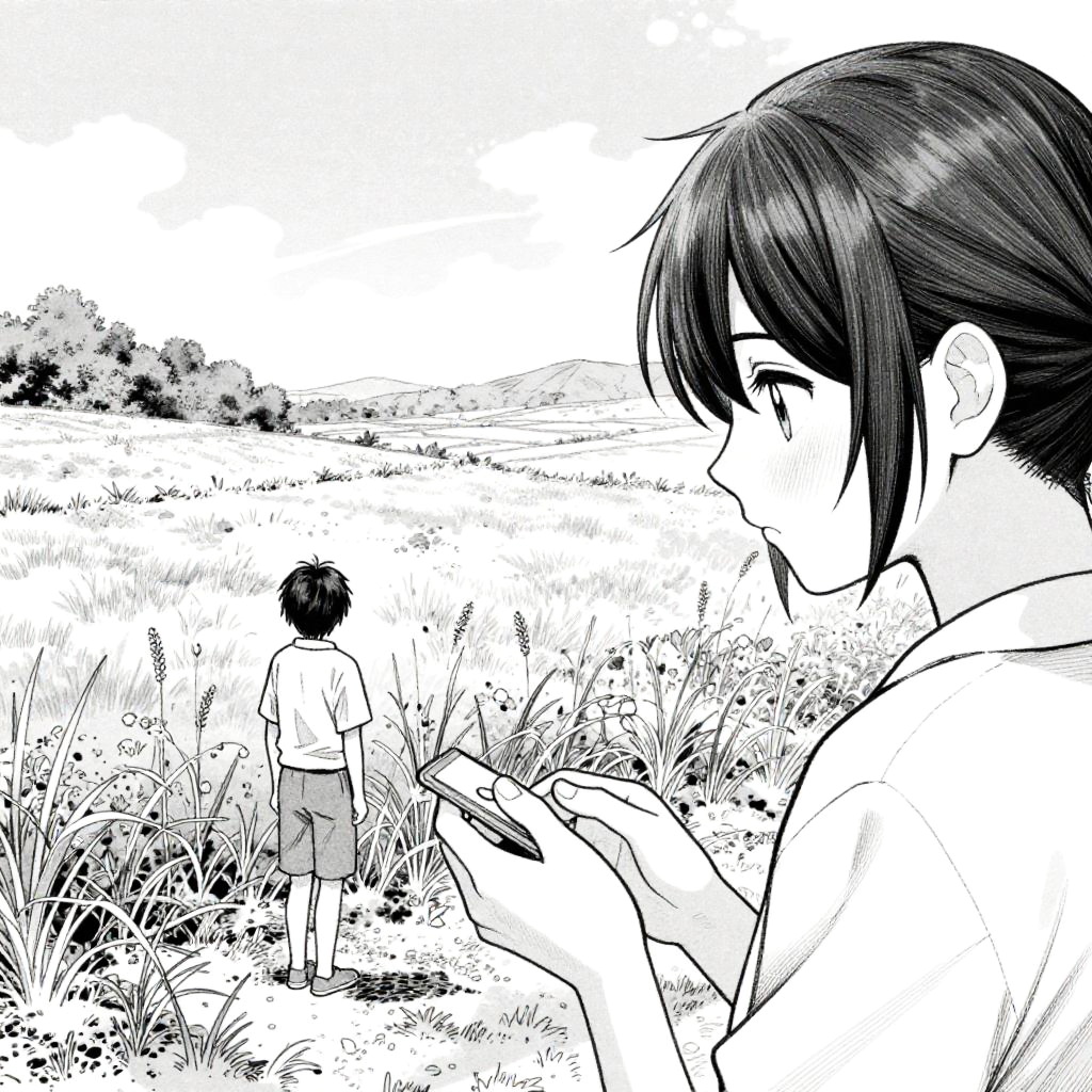 This black-and-white manga-style drawing depicts two young individuals in a grassy field. In the foreground, a girl with short, dark hair and glasses is shown in profile, holding an object close to her chest. She wears a sleeveless top. In the background, a boy with short hair, wearing a t-shirt and shorts, stands facing away, also holding something in his hands. The field is expansive with detailed grass and a distant tree line on the left. The scene is serene, with a clear sky and soft shading adding depth. The artist's style emphasizes clean lines and expressive character designs.
