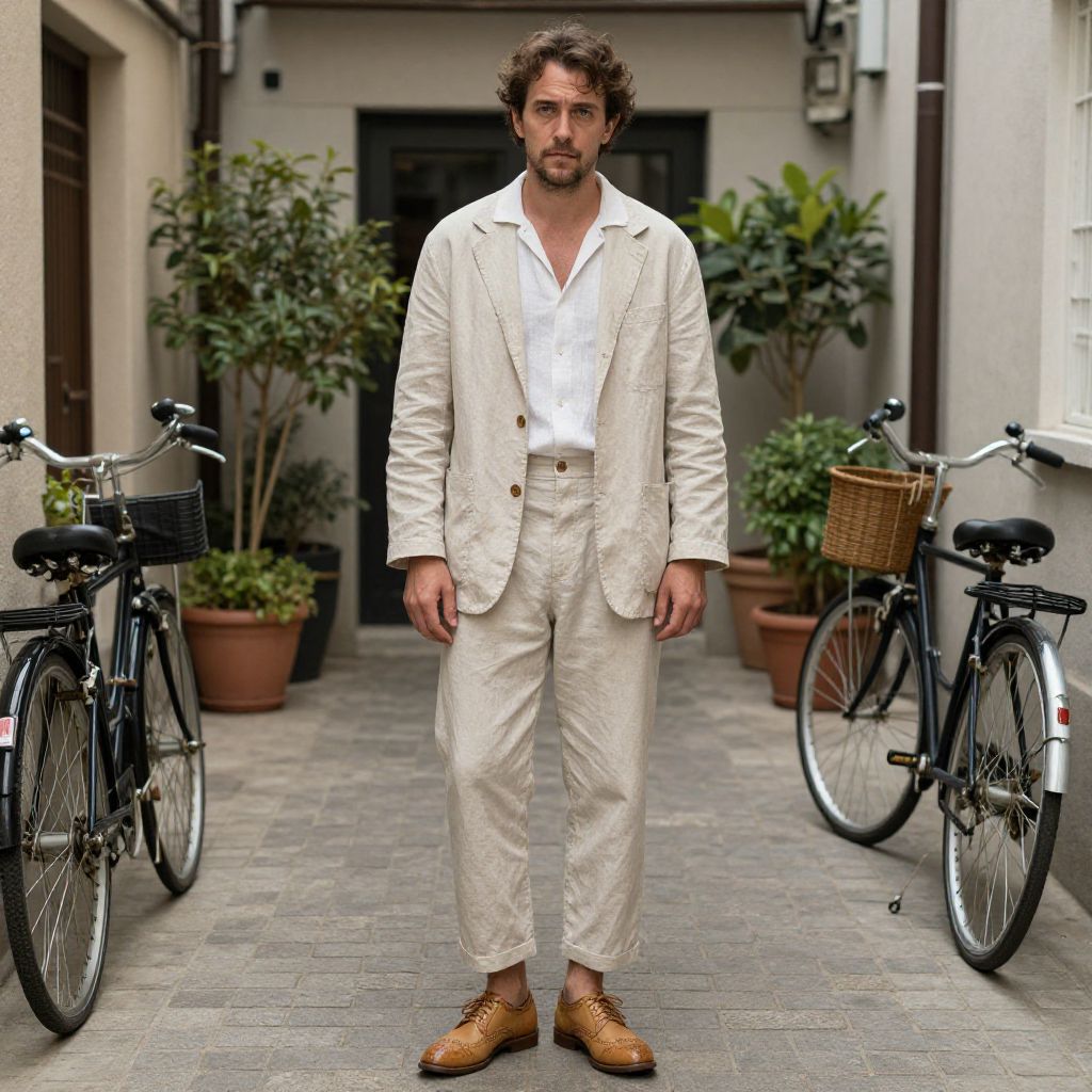 A man, light beige cotton suit, relaxed fit, unstructured blazer, cropped trousers, white linen shirt, tan leather brogues, quaint alleyway, vintage bicycles parked, potted plants lining the entrance, cinecolor, thoughtful expression. Man has masculine face and piercing eyes