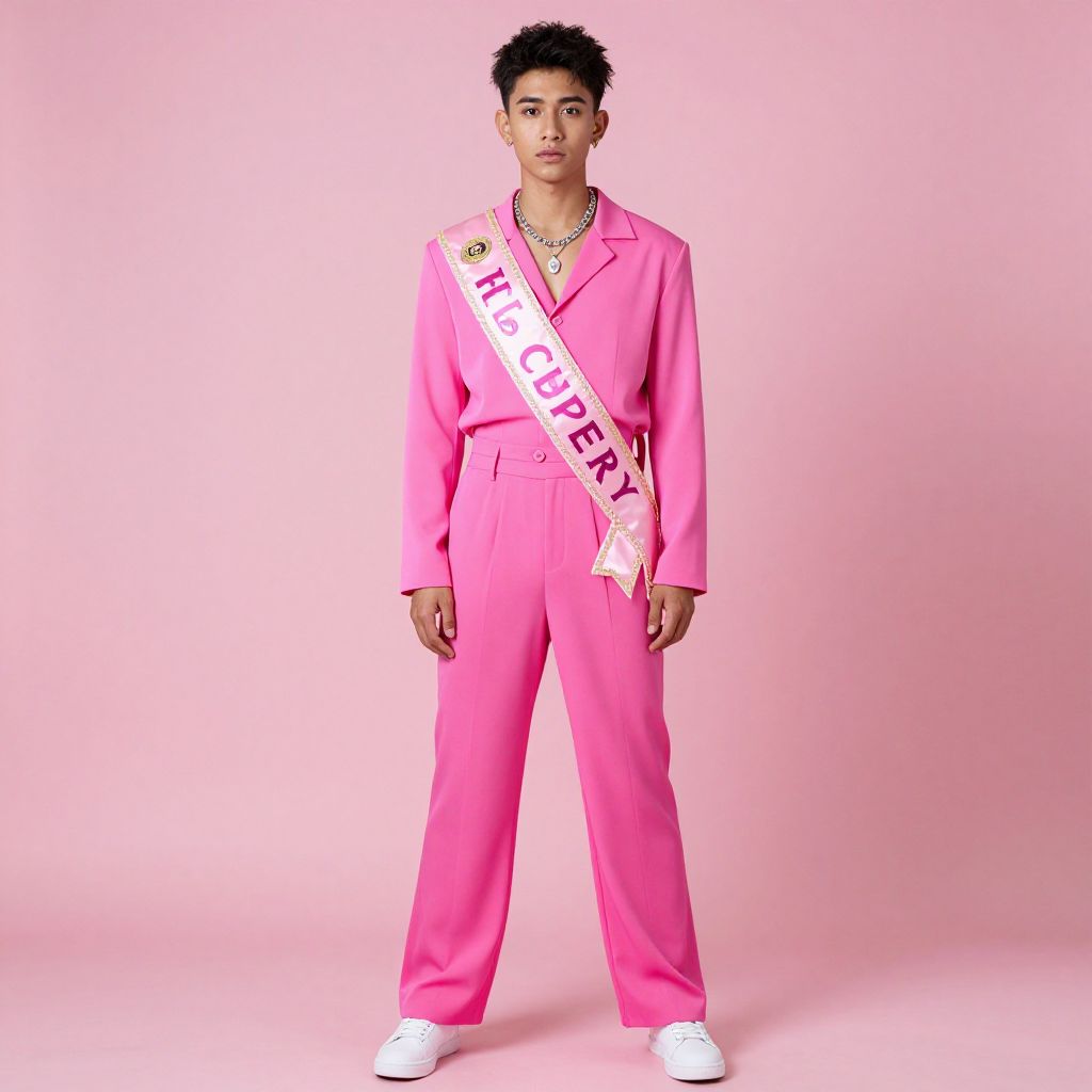 "tickled pink costume, solo, full body, standing, looking at viewer, 1boy, male focus, long sleeves, jewelry, 1girl, pink background, sash, pants Realistic photo of casual sexy person with pretty face"
