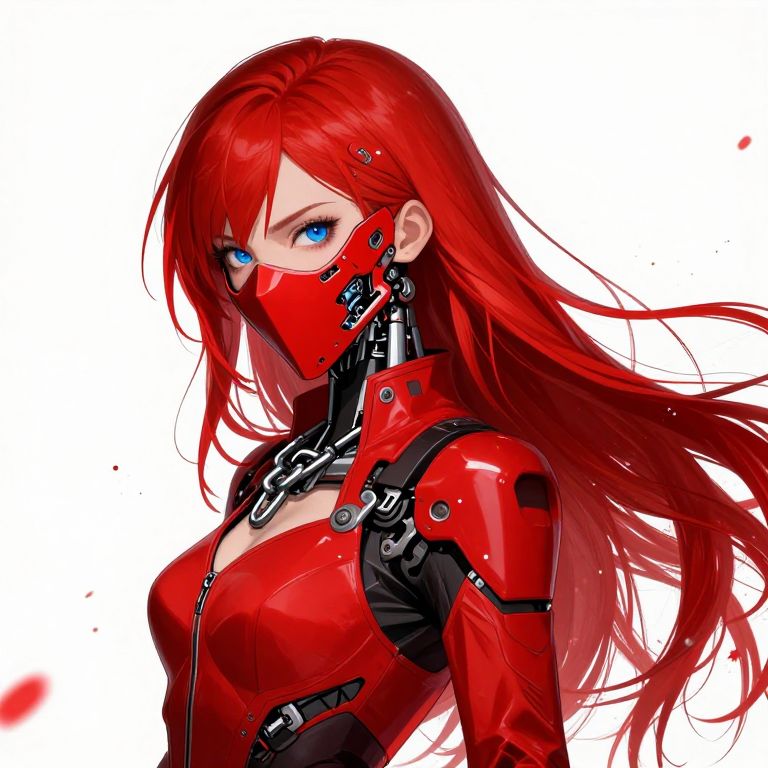 A captivating digital artwork portrays a fierce female protagonist embodying a cyberpunk aesthetic, Her long, vibrant red hair cascades down her back, contrasting with her striking blue eyes, Clad in a form-fitting red suit or armor, she dons a captivating red mask that partially conceals her face, revealing mechanical or robotic components reminiscent of advanced technology, With a heavy chain adorning her neck, she exudes an edgy, dystopian vibe, Amidst the predominantly white backdrop, splashes of red echo her signature hues, hinting at a dynamic and potentially chaotic scene, The intricate, graphic style of the artwork accentuates bold contrasts and vibrant color saturation, immersing viewers into a riveting, cinematic atmosphere that transports them to a futuristic or science fiction universe