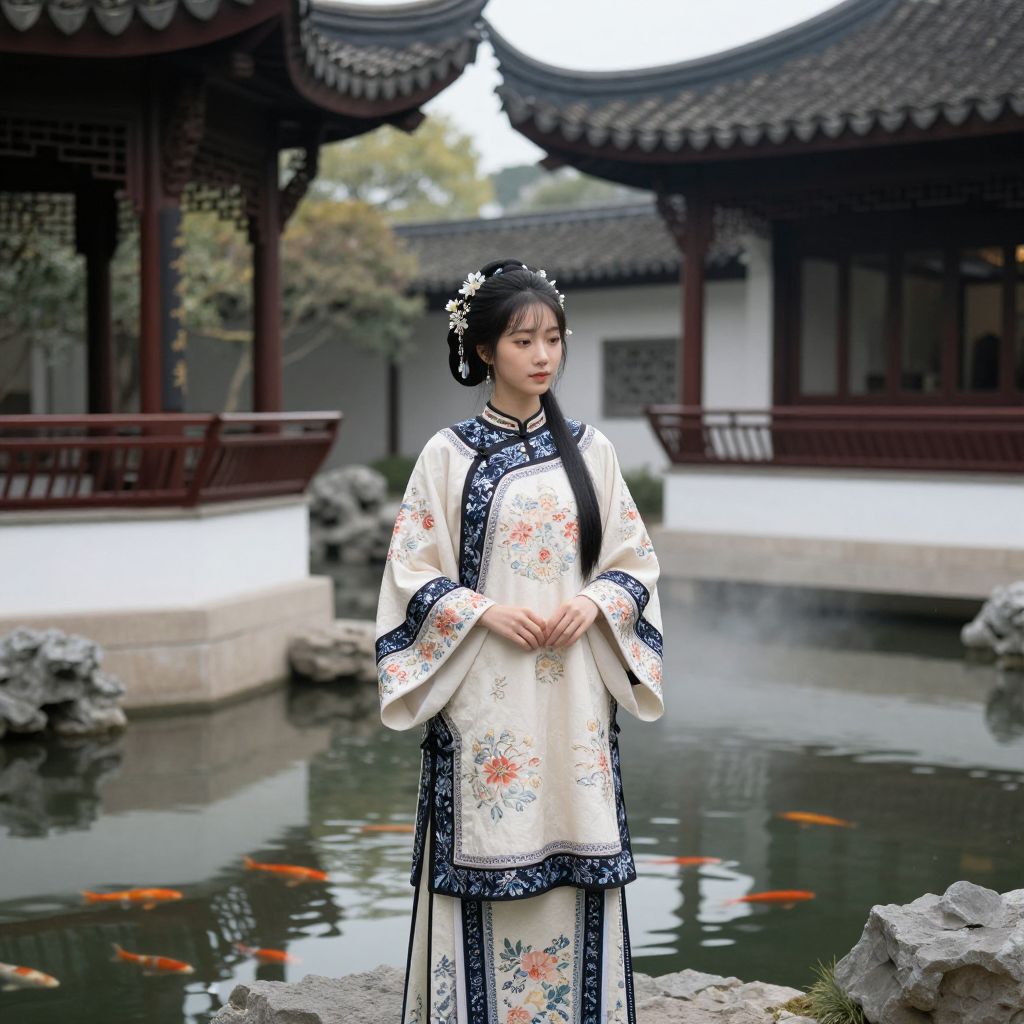 A model wearing a traditional Chinese dress with delicate floral patterns and embroidery, standing by a tranquil koi pond under ornate wooden pavilions, soft mist surrounding the scene, capturing the harmony of classic East Asian architecture and fashion.
