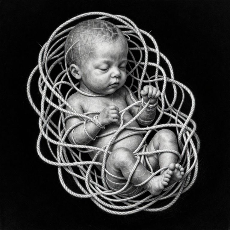 The image presents a highly detailed, black and white sketch of a fetus wrapped in an intricate network of umbilical cord and wiremesh. The fetus is depicted in a photorealistic manner, with an array of ropes and cords entwined around it, creating a complex and textured appearance. The wiremesh enveloping the fetus adds an additional layer of detail, enhancing the hyper-realistic quality of the artwork. The fetus is positioned centrally, with the umbilical cord and wiremesh forming a dense, almost organic web around it. The background is a stark black, which contrasts sharply with the white fetus and the intricate patterns of the umbilical cord and wiremesh, emphasizing the detailed textures and the depth of the composition. The overall arrangement of the elements creates a sense of tension and complexity, with the fetus appearing both vulnerable and resilient within the confines of the umbilical cord and wiremesh. The image is devoid of any vibrant colors, relying solely on the interplay of black and white to convey its intricate details and hyper-realistic quality.