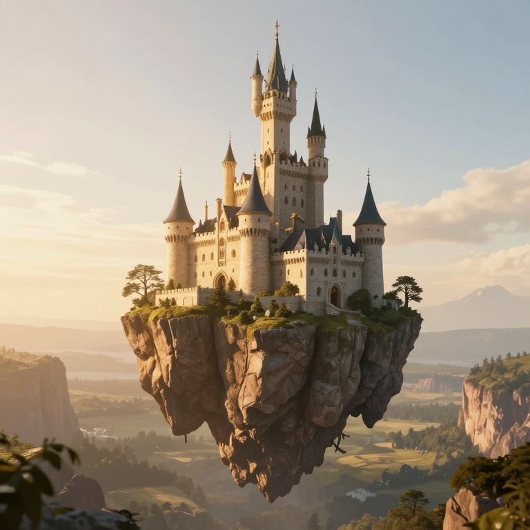 A fantastical 3D-rendered castle perched atop a floating cliff, bathed in the ethereal glow of golden-hour lighting, hovers serenely above a sprawling valley, evoking a sense of otherworldly migration and collective memory.