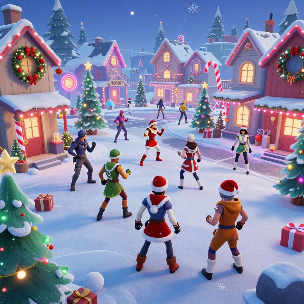 Christmas Fortnite background showcasing a dynamic battleground set in a snow-blanketed town decorated with holiday wreaths, candy canes, and sparkling Christmas trees, Fortnite characters in holiday costumes mid-action, glowing neon accents, immersive and energetic scene.