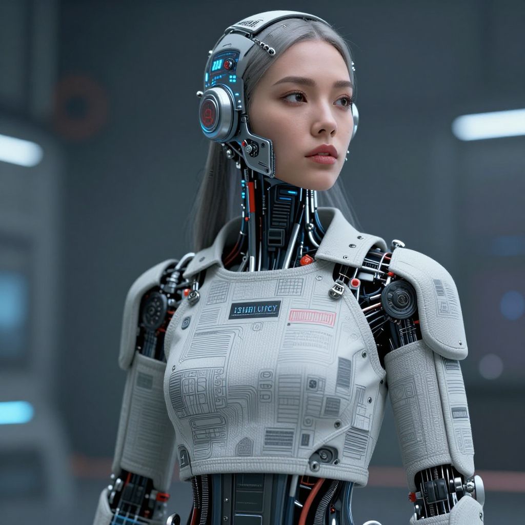 A digital CGI image of an Asian female cyborg with long black hair, wearing a futuristic, white, armored exoskeleton with intricate circuitry patterns. She has a sleek, robotic head with blue and red lights on the sides and a headphone-like device on her head. Her mechanical joints and exposed wires are black with red accents. The background is a blurred, dark, industrial setting with soft blue lights. Her expression is focused and slightly serious. The image has a realistic, high-detail style, emphasizing the contrast between organic and robotic elements.