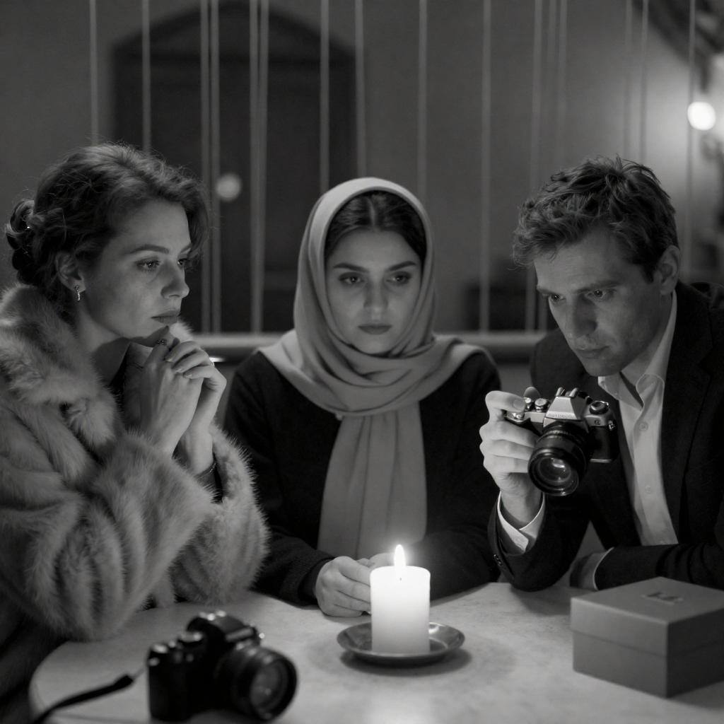 Black-and-white photograph. Three people at a table with a candle. Woman on left in fur coat, hands clasped, looking thoughtful. Middle woman in headscarf, serious expression, hands resting on table. Man on right in suit, holding camera, intense gaze at candle. Background with vertical strings and blurred objects. Candle lit, objects on table including camera and box.