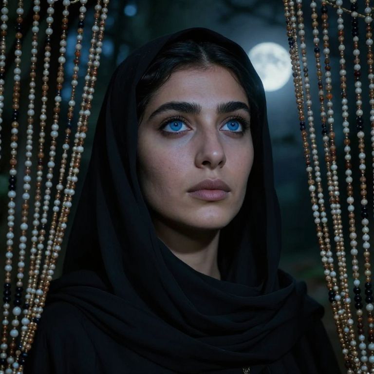 Photograph of a young woman with fair skin and striking blue eyes, wearing a black headscarf that drapes over her shoulders. She has dark, wavy hair peeking from under the scarf. The background is dark, with a moon glowing in the distance, partially obscured by hanging strings of white and brown beads that frame her face. Her expression is calm and introspective. The image is highly detailed, emphasizing her delicate features and the soft, ethereal light from the moon. The overall mood is mystical and serene.