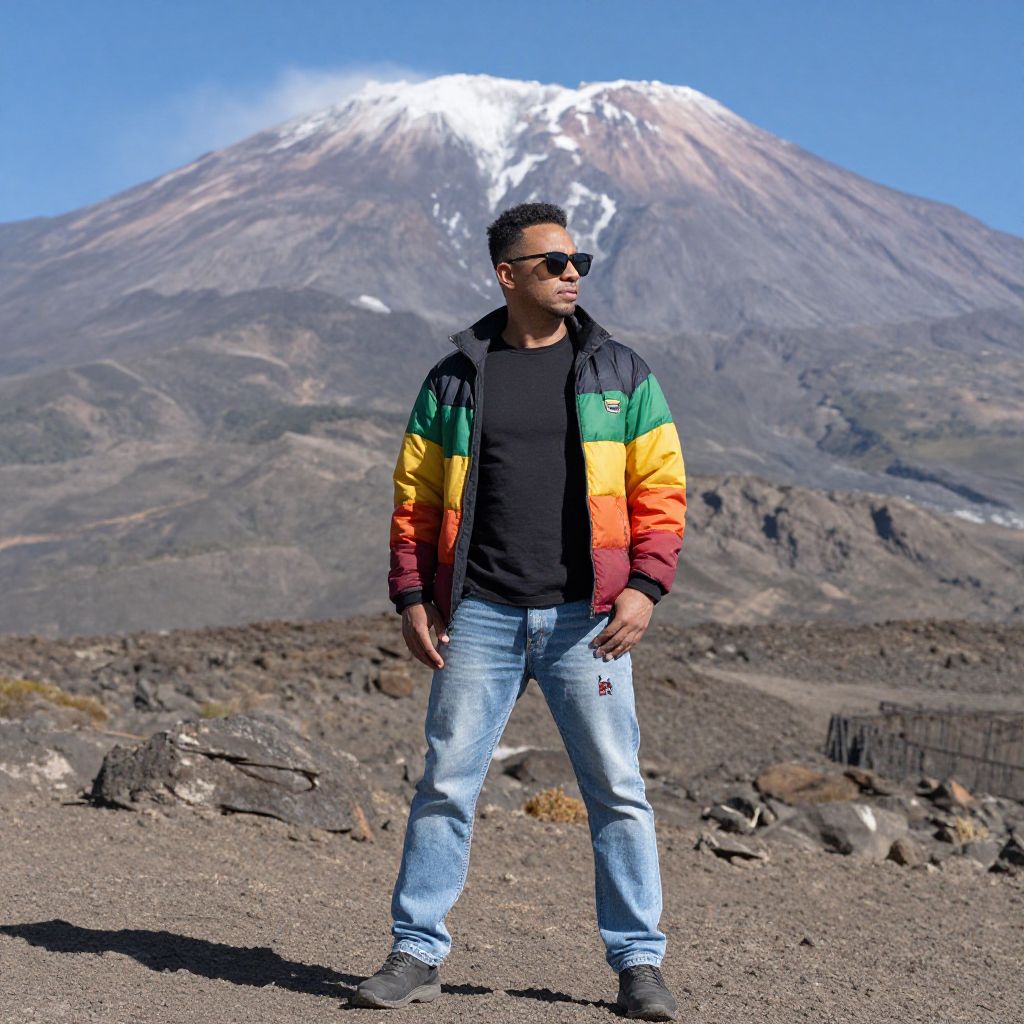 A stylish man stands confidently in front of Mount Kilimanjaro, dressed in a colorful jacket and casual jeans, showcasing an artistic and adventurous spirit against the backdrop of the iconic peak.