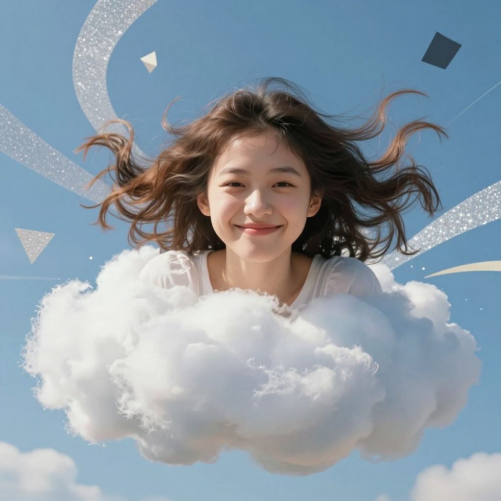 Masterpiece, best quality, movie still, 1girl, floating in the sky, cloud girl, cloud, (close-up:1.1), bright, smug, smirk, happy, fun, soft lighting, volumetric lighting, Bauhaus, shapes, lines, sparkling, glittering, swirling, abstract, expressive