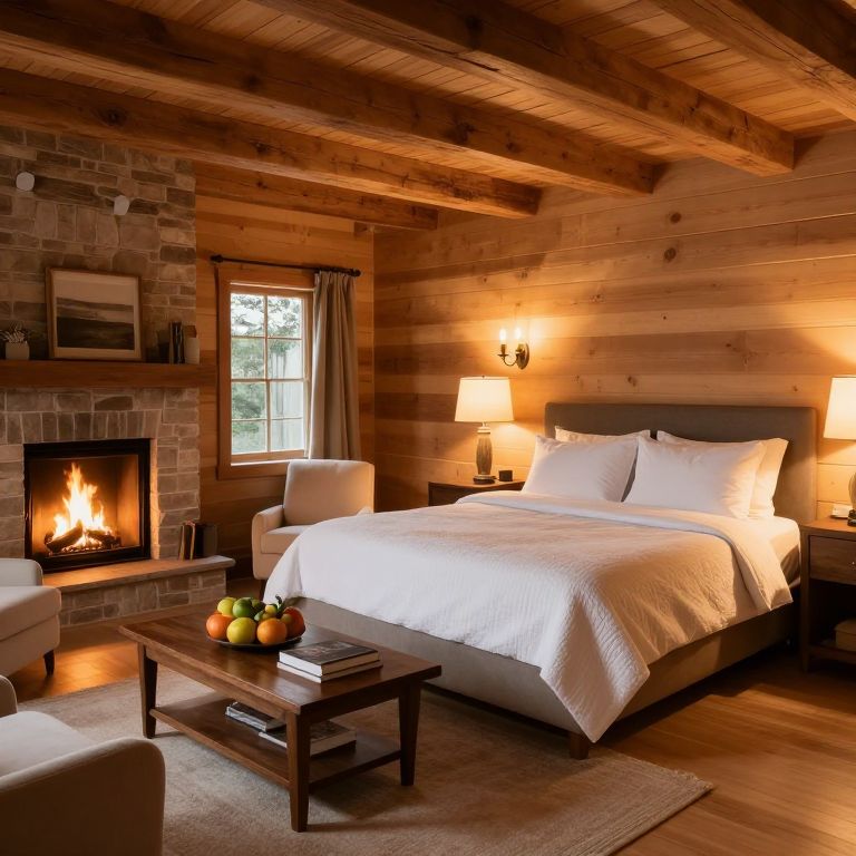 Cozy Wooden Bedroom with Fireplace and Seating Area
